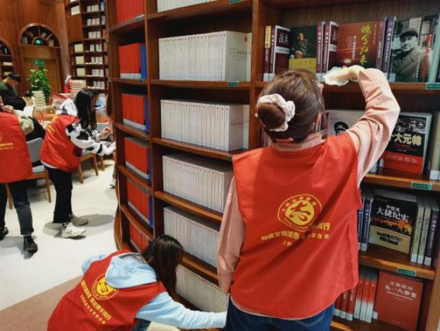 参观学习结束后,进行了志愿服务活动。同学们分别前往习近平新时代中国特色社会主义思想文献区、马克思主义文献区、干部学习培训书籍区、红色文化著作区、期刊区、电子学习阅览区六个专区,整理书籍,打扫卫生。大家仔细将书籍归类收纳,正确摆放,细心擦拭了书架、桌凳。