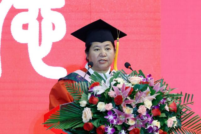 校长、校学位评定委员会主席姚丽英为研究生毕业生颁发学位证书。