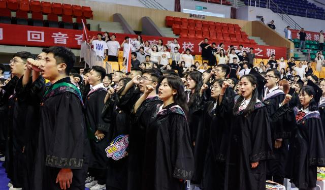 全体毕业生神情肃穆、庄严宣誓:厚德载物,博学自省,慎思明志,笃行以敬……心怀伟大中国梦,共筑时代民族魂。誓言铿锵,征程启航。