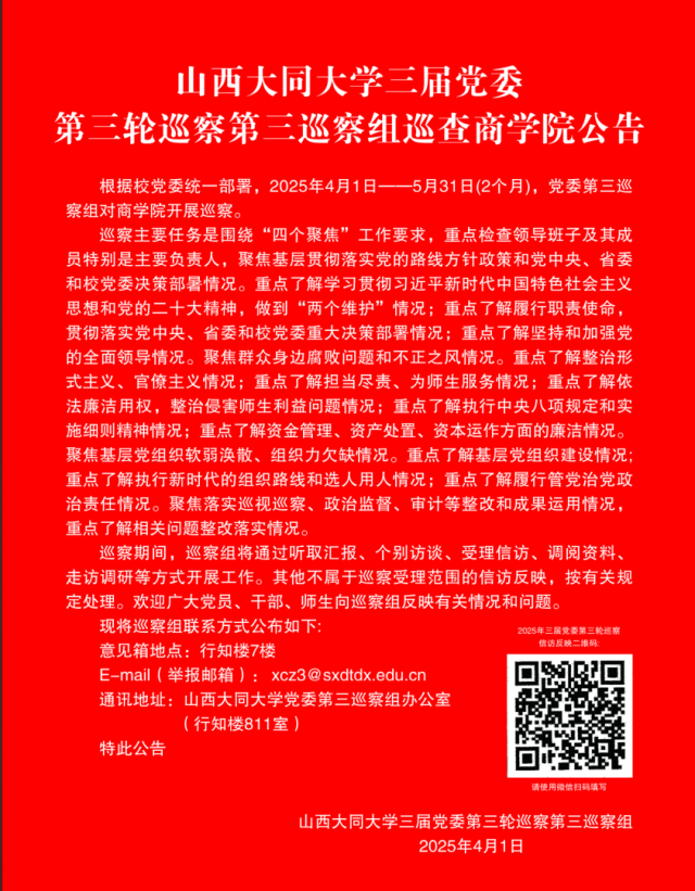 校党委第三巡察组巡察时间为2025年4月至5月。为便于广大干部群众、师生员工反映情况,巡察组公布电子邮箱、意见箱及举报二维码。受理信访举报的时间为工作日的上午:8:00-12:00,下午:2:30-6:00。具体联系方式:第三巡察组电子信箱(举报邮箱):xcz3@sxdtdx.edu.cn;意见箱在行知楼7楼大厅,并在学院张贴巡察进驻公告。