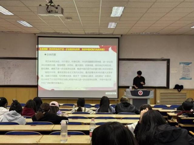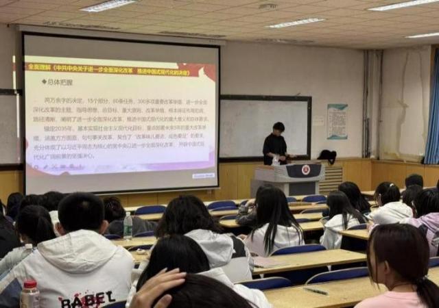 宣讲会上,主讲人围绕全会精神的背景意义、核心要义及实践要求展开深入解读。重点剖析了《中共中央关于进一步全面深化改革、推进中国式现代化的决定》中与青年群体息息相关的战略部署,包括构建青年发展体系,强调教育、就业、创新等领域改革对青年成长的重要支撑;深化思政教育创新,以“大思政课”为载体,推动党的创新理论入脑入心;强化实践育人机制,鼓励青年投身乡村振兴、科技创新、社会治理等一线,锤炼过硬本领。同时,主讲人结合商科专业特色,提出“三个结合”学习路径,即将全会精神与商业伦理教育结合,厚植家国情怀;与商科专业学习结合,培养服务国家战略的复合型人才;与职业发展结合,激励学生在新时代经济建设中建功立业。