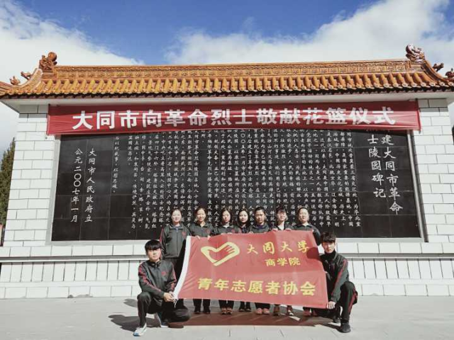 (4)9月30日上午九时三十分,“向革命烈士敬献花篮仪式”在大同市烈士陵园隆重举行。我院青年志愿者协会志愿者们由负责人带队参与了烈士陵园奏唱国歌、默哀、向革命烈日敬献花篮等工作。使同学们更加珍惜今天的幸福生活,树立远大理想,加强社会主义核心价值观。